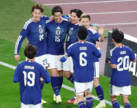サッカーの国際親善試合は18日、東京・国立競技場で行われ、日本代表はボリビア代表に3―0で快勝した。写真は前半、先制ゴールを決め祝福される鎌田(左から3人目)。 【時事通信社】