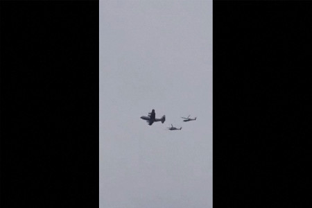米イラン両国のメディアは3日、イランが米軍のF15戦闘機を撃墜したと報じた。写真は、イラン南西部上空を飛行する米航空機とヘリコプター=SNSに同日投稿された動画より 【AFP時事】