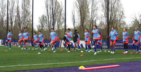 サッカー日本女子代表(なでしこジャパン)は14日に、米ワシントン州シアトルで米国との国際親善試合3連戦の第2戦に臨む。写真は第2戦に向けて調整するなでしこジャパン=13日 【時事通信社】