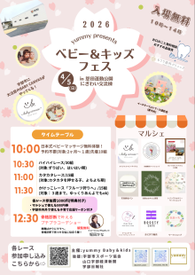 親子向けイベント「ベビー&キッズフェス」が4月5日、宇部の恩田運動公園にぎわい交流施設(宇部市恩田町4)で開催される。主催は、市内で赤ちゃん向け企画を展開する「yummy baby&kids(ヤミー・ベビーアンドキッズ)」。