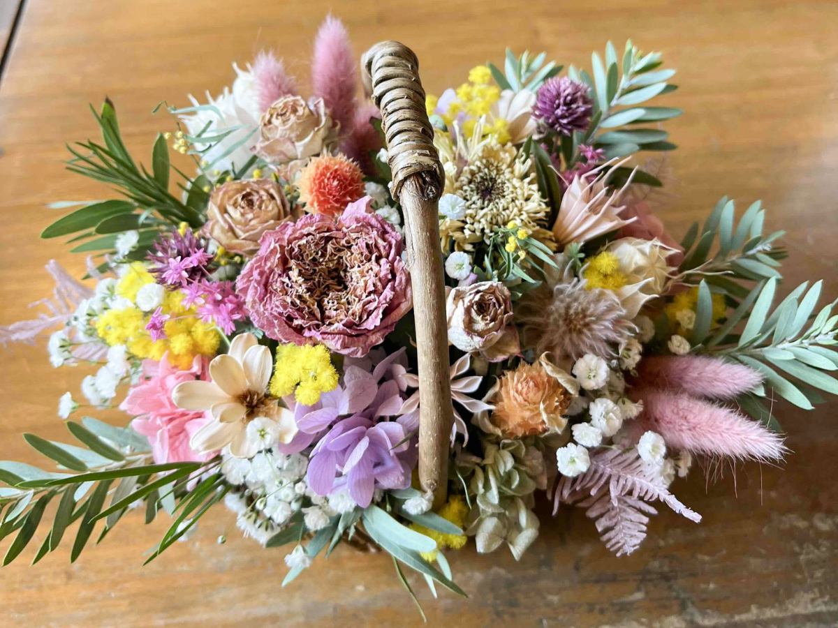 山陽小野田の「トキメキ雑貨collection」で販売する「ドライフラワーかごアレンジ」