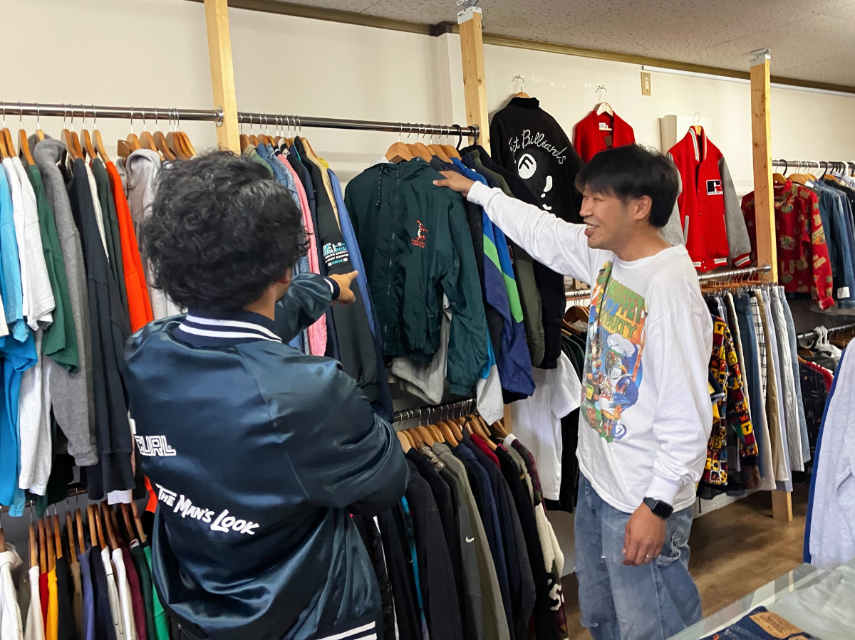 宇部の古着店「ROMU」で商品を選ぶ様子