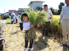刈り取った稲は、昔ながらの「はぜかけ」でじっくりと乾燥させる。園児は「(稲が)重たい!」「赤とんぼ、カエルがおった!」など、田んぼの生き物にも興味津々の様子だった