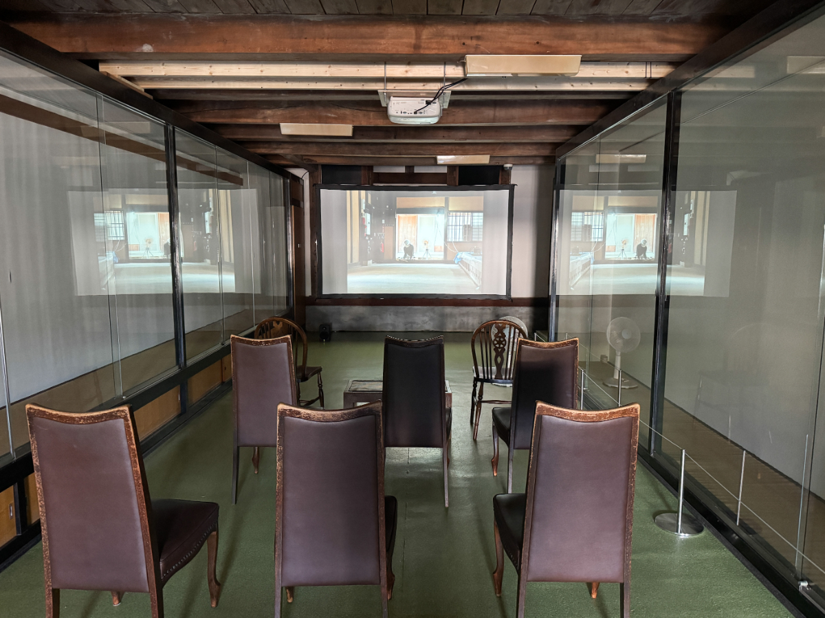 国指定重要文化財「熊谷美術館」の蔵で放映されている映像作品「三和土」の様子。伝統工法による三和土修復の様子を、映像作家の松本桂さんが納めた。1965(昭和40)年の開館当初より公開されてきた屏風、掛け軸、茶道具、初公開の湿版写真とフィルム写真などの膨大な資料を「記録」という観点から構成、展示している。10月4日から12月28日まで