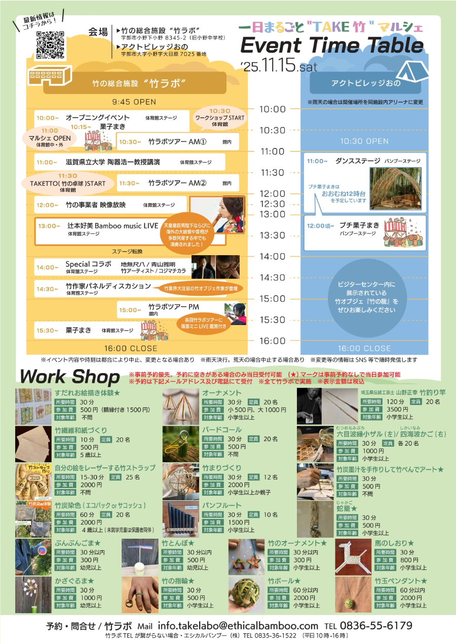 マルシェイベント「一日まるごとTAKE竹マルシェ」が11月15日、竹の総合施設「竹ラボ(旧小野中学校)」(宇部市小野下小野)と体験学習施設「アクトビレッジおの」で開かれる。