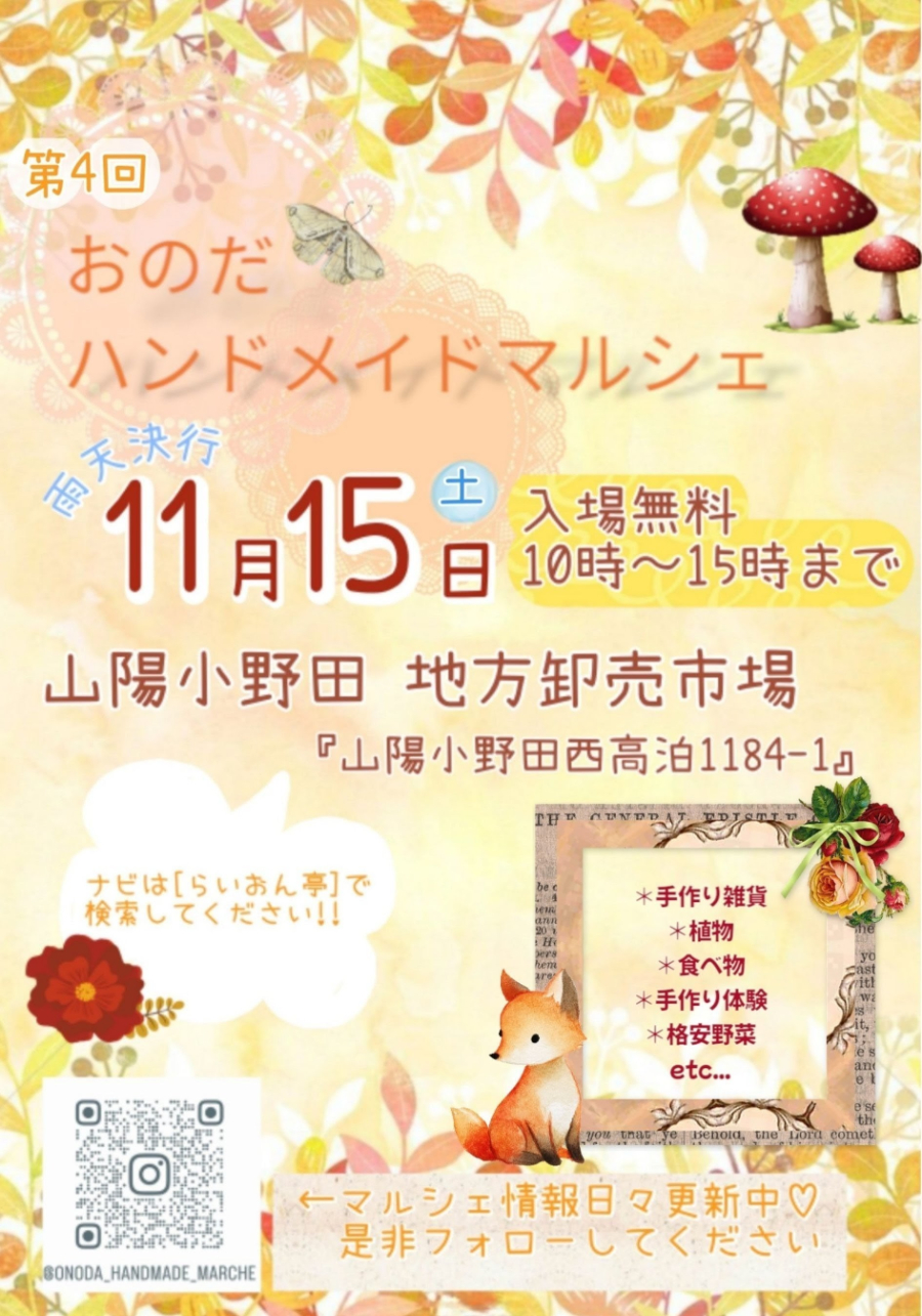 マルシェイベント「おのだハンドメイドマルシェ」が11月15日、「山陽小野田地方卸売市場」(山陽小野田市西高泊)で開かれる。