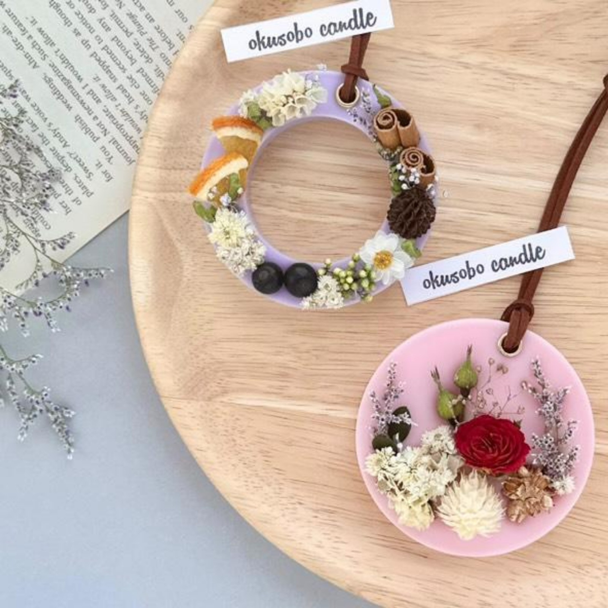 ドライフラワーを使ったキャンドルやアロマワックスサシェを販売する(写真提供=おのだハンドメイドマルシェ実行委員会)