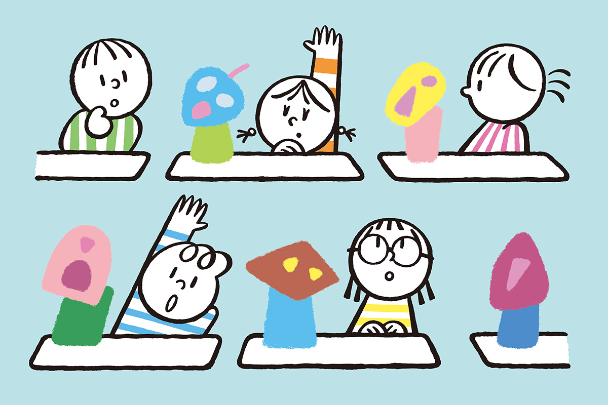 50分の上映時間のうち、前半ではロボットからの問いかけに参加者が答え、後半ではその答えをもとにロボットたちがセリフを生成し、前半の授業を演劇として再現する。秋山さんは「一人一台手元にロボットがある状況でパフォーマンスができるのは当館ならでは。参加者の回答により後半の演劇のストーリーも変わってくるので、ぜひ何度も参加してその都度違ったエンディングを楽しんでもらいたい」と話す(写真提供=山口情報芸術センター、イラストレーション:_fancomi)