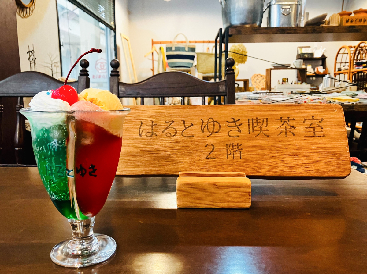 宇部の「はるとゆき喫茶室」が提供する「セパレートソーダ(2色のクリームソーダ)」