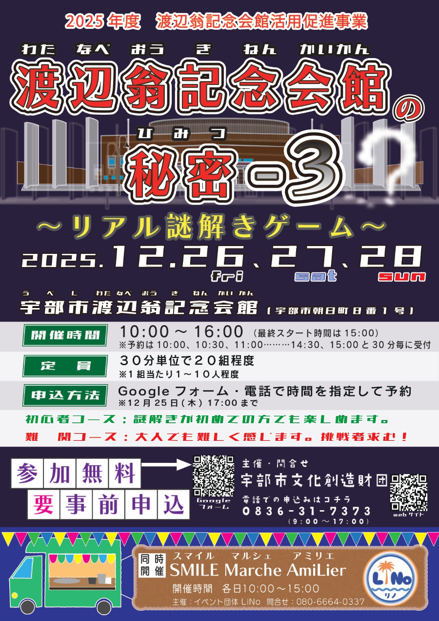 リアル謎解きゲームイベント「渡辺翁記念会館の秘密-3 ~リアル謎解きゲーム~」が12月26日~28日の3日間、宇部で開催される。