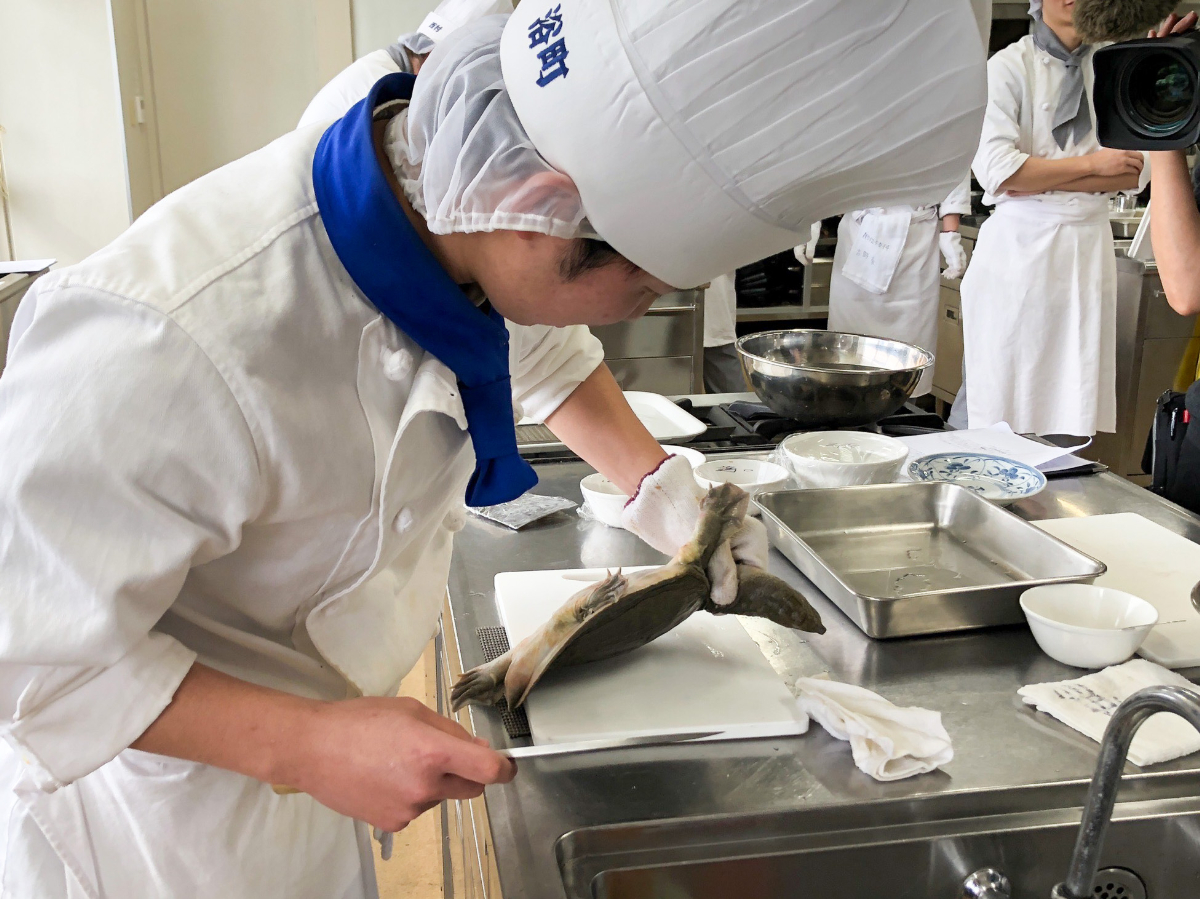 JR新山口駅近くの「YIC調理製菓専門学校」(山口市小郡黄金町)で2月16日、「すっぽん」を用いた調理実習が行われた。