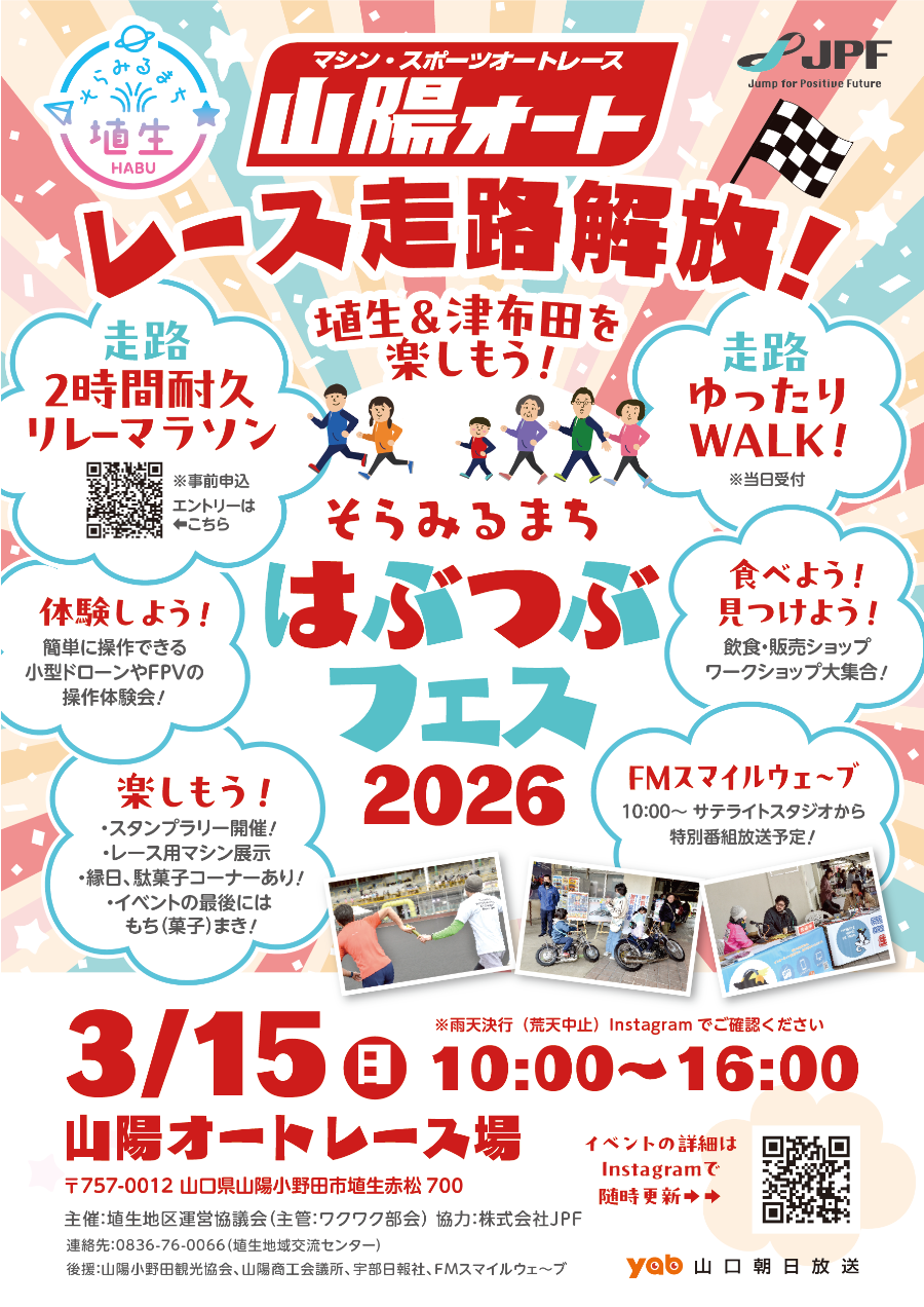 山陽小野田の埴生・津布田地区を盛り上げるイベント「そらみるまち はぶつぶフェス2026」が3月15日、「山陽オートレース場」(山陽小野田市埴生)で開催される。
