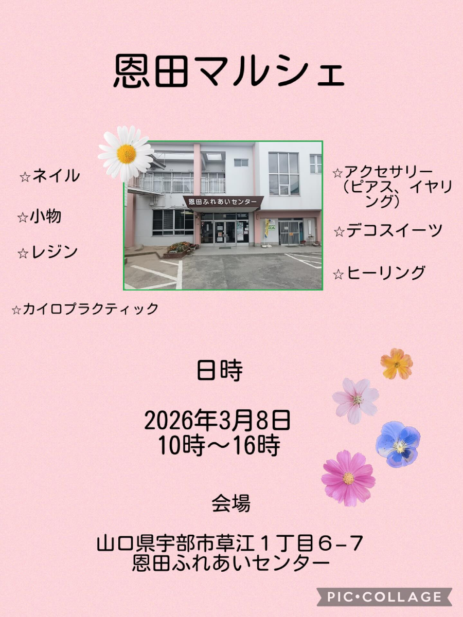 マルシェイベント「恩田マルシェ」が3月8日、宇部の「恩田ふれあいセンター」(宇部市草江1)で開催される。