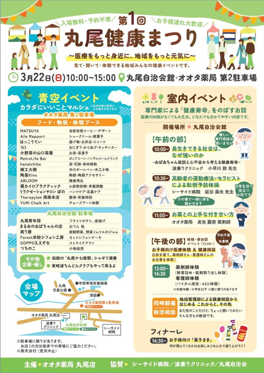 地域密着型のイベント「丸尾健康まつり」が3月22日、宇部市東岐波の「オオタ薬局丸尾店 第2駐車場」と「丸尾自治会館」を会場に開催される。