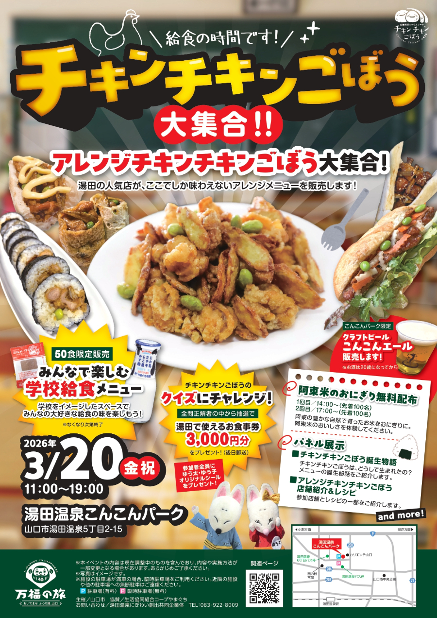 山口市発祥のグルメ「チキンチキンごぼう」をテーマにしたイベント「チキンチキンごぼう大集合!!」が3月20日、「湯田温泉こんこんパーク」(山口市湯田温泉5)で開催される。