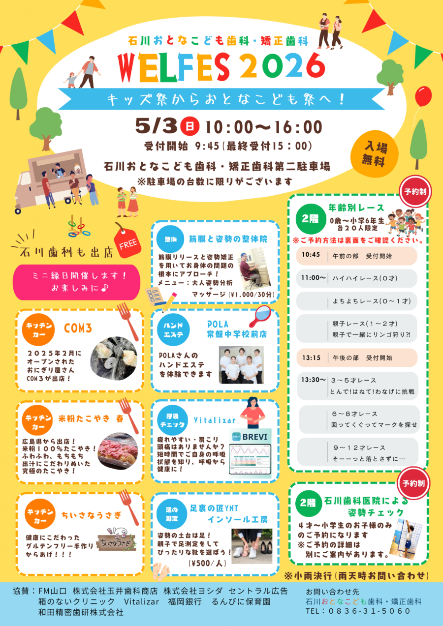 宇部の「石川歯科WELFES 2026 ~おとなこども祭!~」チラシ表面