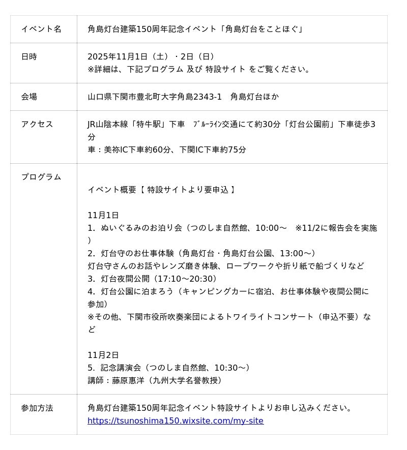 灯台建築研究所は、2025年11月1日(土)・2日(日)に角島灯台建築150周年記念イベント「角島灯台をことほぐ」を開催いたします。このイベントは、日本財団「海と日本プロジェクト」の一環として、灯台を中心に地域の海の記憶を掘り起こし、地域と地域、異分野と異業種、日本と世界をつなぎ、新たな海洋体験を創造していく「海と灯台プロジェクト」の助成を受けて実施します。
