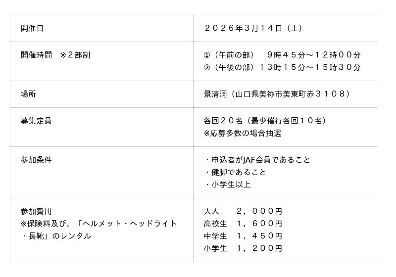 JAF(一般社団法人 日本自動車連盟)山口支部(支部長 佐藤宏彦)は、3月14日(土)に、景清洞(山口県美祢市)にて、JAF会員向けのイベントを開催いたします。