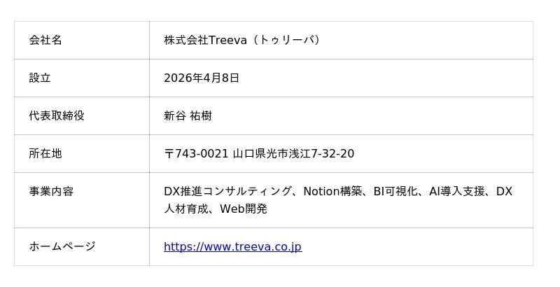 株式会社Treeva(本社:山口県光市、代表取締役:新谷 祐樹、以下「Treeva」)は、2026年4月8日に設立いたしました。Notion構築によるデータ管理基盤の整備、BIツールによる経営データの可視化、AI導入支援、DX人材育成を通じて、企業のデジタルトランスフォーメーション(DX)を伴走支援するコンサルティング企業です。「Cultivate Innovation, Realize Value.(革新を耕し、価値を実らせる。)」を理念に掲げ、「何から始めればいいかわからない」という段階から自走できる組織になるまで、代表自らがPMとして伴走します。