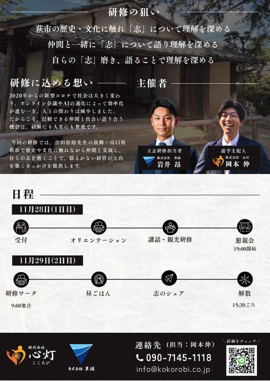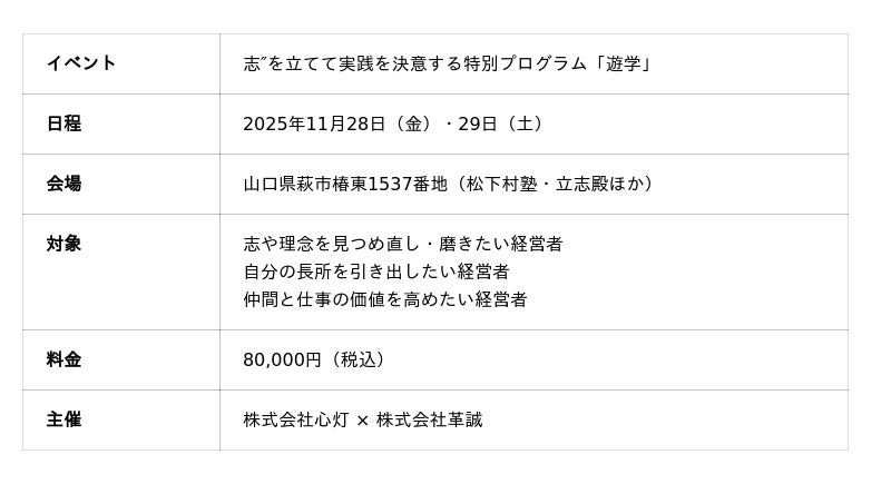 株式会社心灯(本社:愛媛県松山市、代表取締役:岡本伸)は、株式会社革誠(本社:愛媛県松山市、代表取締役:岩井昴)と共同で、幕末の志士を数多く輩出した吉田松陰ゆかりの地・山口県萩市にて、新サービス「遊学」を2025年11月28日(金)・29日(土)に開催いたします。