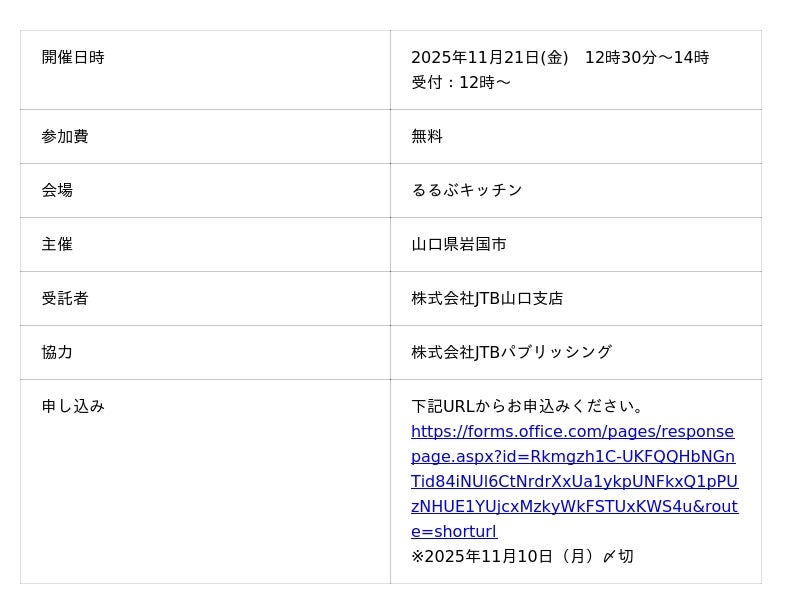 山口県岩国市は、特産品の認知度向上や岩国市への観光誘客、周遊促進を目的に、2025年11月1日(土)~11月28日(金)の間、岩国市の名産品である「岩国れんこん」をはじめ、ブランド牛の「高森和牛」や和栗最大級の大きさで強い甘みの「岸根(がんね)栗」、国内外で高く評価される「日本酒」など、味覚で岩国市の魅力が体感できるタイアップイベントを「るるぶキッチン(東京都新宿区)」にて開催します。