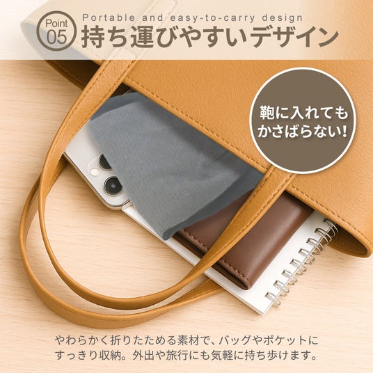 折りたたみやすい素材でバッグの中でも場所をとらず、