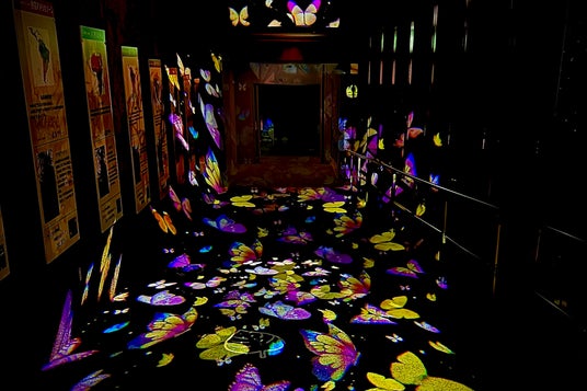 - 光る蝶 × 月のオブジェ:光る蝶が館内の3.5mの月までを導きます。