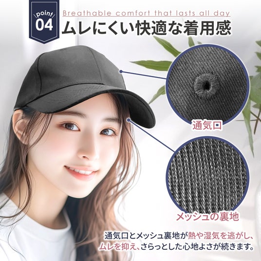 普段使いから運動時、外でのアクティビティまで、幅広いシーンで取り入れやすいデザイン。服装を選ばず、自然とスタイルに馴染む万能キャップです。
