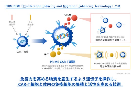 PRIME 技術とは、がん治療に用いる CAR-T 細胞などの免疫細胞をさらに改良して、インターロイキン-7 (IL-7)と CCL19 を産生させるノイルイミューン独自の技術であり、T 細胞の増殖や生存維持を促進すると同時に、T 細胞や樹状細胞の遊走能を向上させ、がんに対する治療効果を向上させる可能性を有しています。PRIME 技術は、がん局所に多くの CAR-T 細胞と体内の免疫細胞を集積させることで、がん細胞を攻撃しやすい環境を作ることを目的として開発されました。