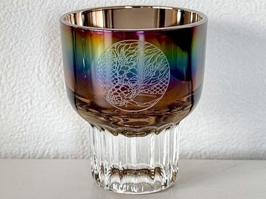龍頭のサンドプラストが施された、虹色に輝くチタンコーティング盃。