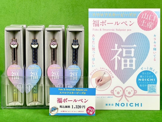 非食品の山口県土産として、「福」をよぶ「フク」をモチーフに制作したキラキラ輝くボールペンを製作。「手頃な価格」で、替え芯もあるので「長く使える」山口土産として展開。