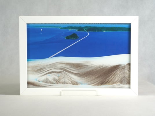 サンドピクチャー4.    上の砂が全て下に落ちたら完成です。背景は山口県の景勝地「角島」を上空から撮影した写真を利用。