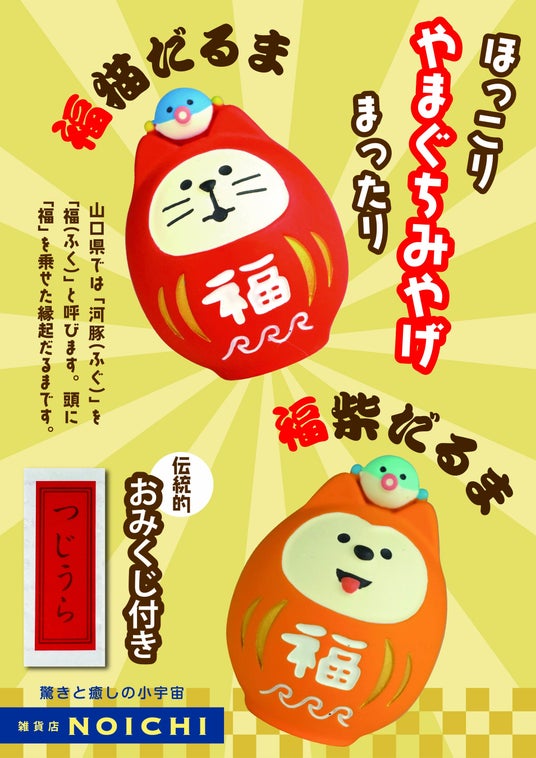 「ふぐ=福」と呼ぶ山口の縁起文化を、“飾って・引いて楽しめる”雑貨にした新・山口土産が誕生しました。山口県内で雑貨店NOICHI(ノイチ)を展開する有限会社溝上企画(本社:山口県周南市、代表:溝上重幸)は幅広い世代に人気の、まったりマスコット「コンコンブル」と山口名産「フク(河豚)」、伝統的おみくじ「つじうら」を融合した新商品、《おみくじ付》福猫だるま・福柴だるまを開発し、2026年1月より販売を開始します。