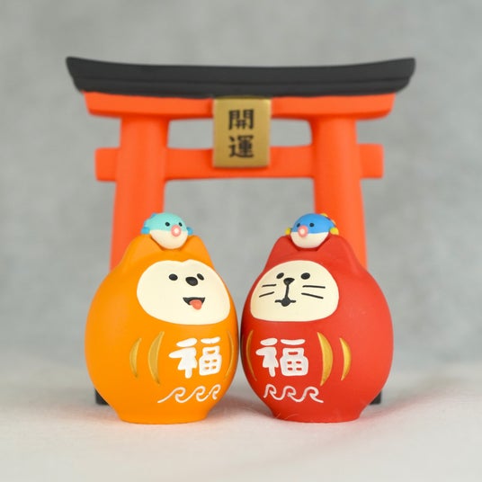 コンコンブルの開運鳥居をバックに、頭に福を乗せた「福柴だるま」と「福猫だるま」