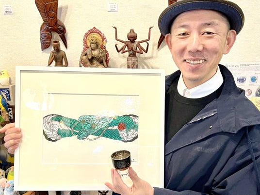国際切り絵トリエンナーレ グランプリ受賞の山口県在住切絵作家・atsuomi氏と、25万分の1mmの薄さでチタン分子を積層させるチタンコーティング職人とのコラボレーション。切絵の龍頭が浮き出るグラスと盃を製作。