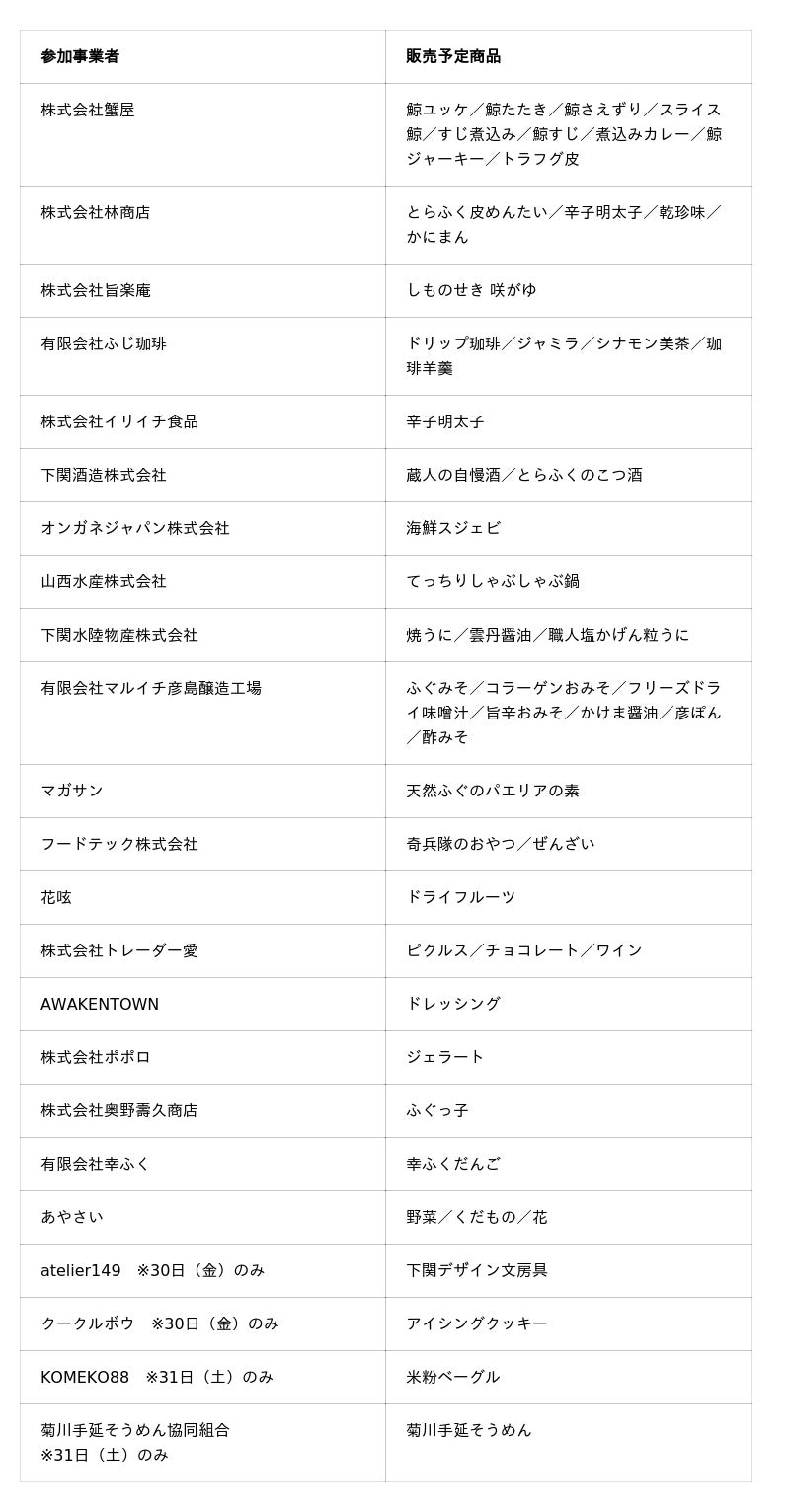 下関市・市内事業者・市民が連携して下関のおいしい産品を広めていく「おいしも!たのしも!」プロジェクトの審査をクリアし、市から認定を受けた事業者を中心に出店。「鯨ユッケ」「とらふく皮めんたい」「菊川手延そうめん」「コラーゲンおみそ」など、普段は現地や専門店でしか味わえない逸品を、生産者から直接購入いただけます。そのほか、下関市の農家から届く採れたて野菜を販売する直売所「あやさい」、下関市をモチーフにした文房具ブランド「atelier149」※30日(金)のみ も出店。