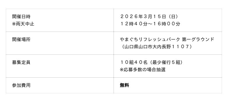 JAF(一般社団法人 日本自動車連盟)山口支部(支部長 佐藤宏彦)は、3月15日(日)に、やまぐちリフレッシュパーク(山口県山口市)にて、親子で楽しく参加できる特別イベント「JAFの運動会~笑顔と絆をエンジンに親子でGO!~」を開催いたします。