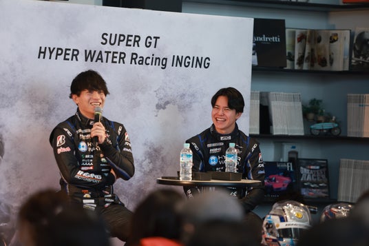 当日は「SANKI VERTEX PARTNERS CERUMO・INGING」の立川祐路監督、阪口晴南選手(38号車)、大湯都史樹選手(39号車)、「HYPER WATER Racing INGING」の堤優威選手、卜部和久選手が登壇し、シーズン開幕を目前に控えた心境や昨シーズンの振り返り、今シーズンの展望などが披露されました。