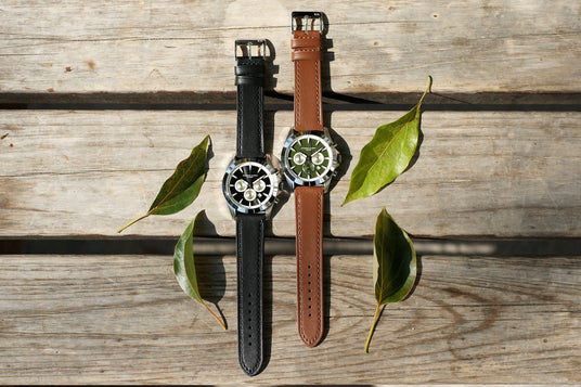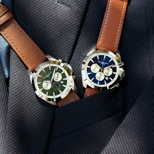 ネイビーやマットグリーンのダイヤルとオフホワイトのインダイヤルの組み合わせによる、さりげないレトロ感。