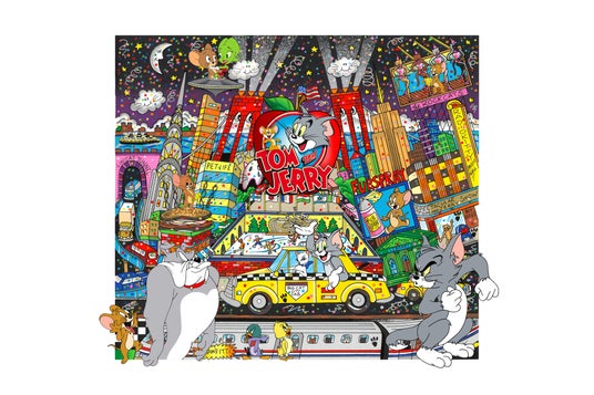 黄色いタクシーやセントラルパークの風景の中で、トムとジェリーがかわいく描かれています。