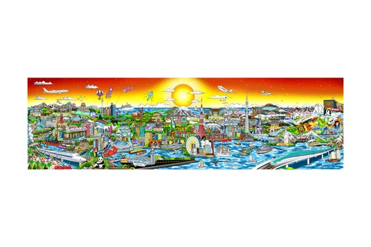 この作品では日本列島を太平洋側から見下ろすような構図で、北は北海道、南は沖縄まで各地の名所が活気ある様子で描かれています。また海の色とは対照的に空は暖かい日差しに覆われ、微かに煌く星々がどこかノスタルジックな感情を思い起こさせる一方で、中心に描かれたご来光はまさに「日出づる国」日本を演出していて、ダイナミックでありながら静けさも感じさせる一作となっています。
