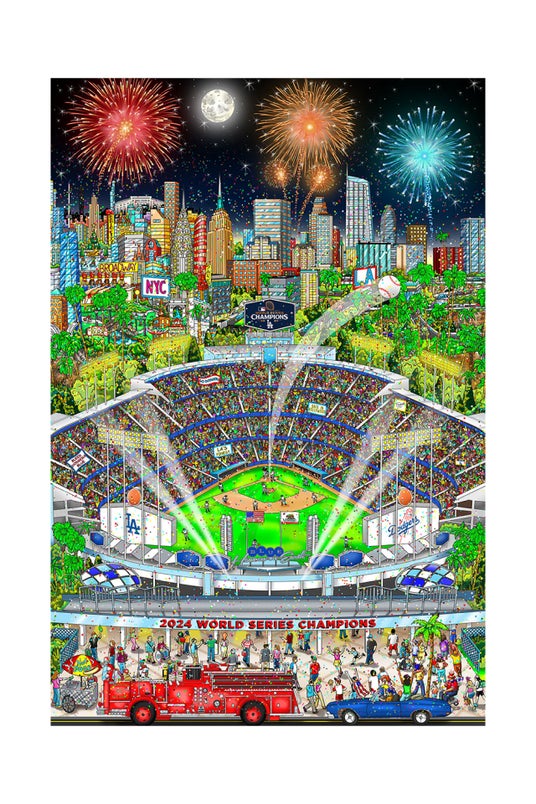 ロサンジェルス・ロジャースが「2024 ワールドシリーズ」を制した瞬間を祝福して描かれたメモリアル作品。背後に広がる都市のスカイラインと夜空を彩る花火が相まり、見る者にもその歓喜か伝わってくるような一作です。