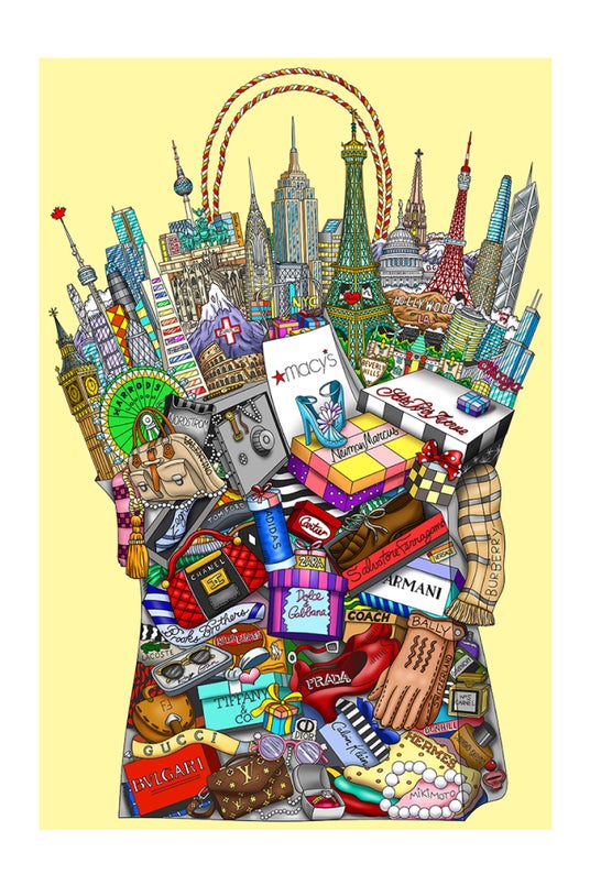 女性なら必需品であるバッグのデザインに世界各国の有名ブランドが溢れんばかりに描かれています。 バッグの中から飛び出るようにして描かれている各都市のランドマークが、思いっきり買い物を楽しんで中身が入りきらない様子を表しており、女性の憧れが詰め込まれているようです。 ※背景色にバリエーションがあり背景色に合わせて額色をご用意しております。背景色と額色はサンプル写真の通りの組み合わせとなります。